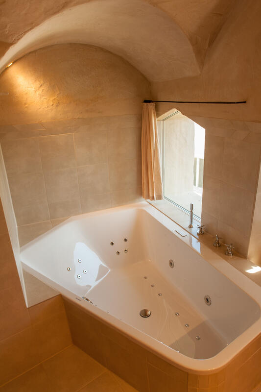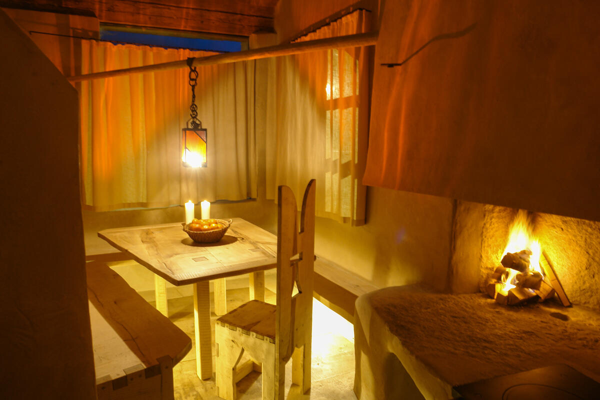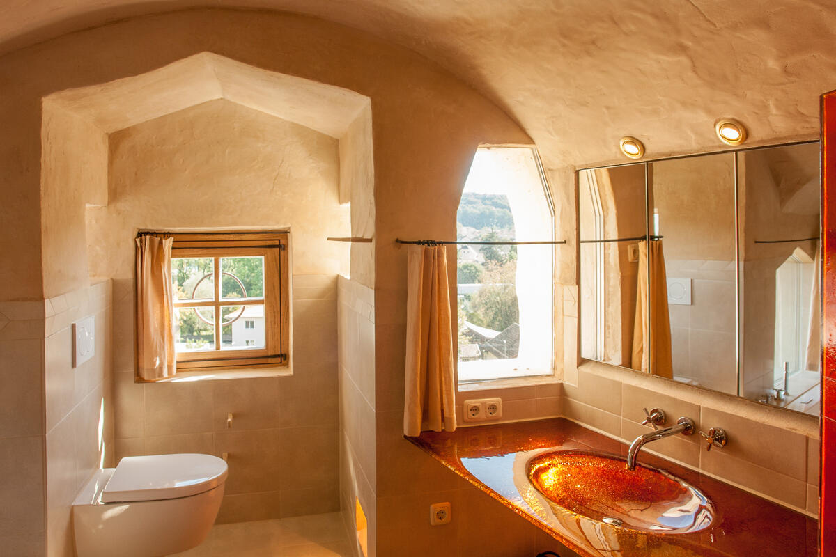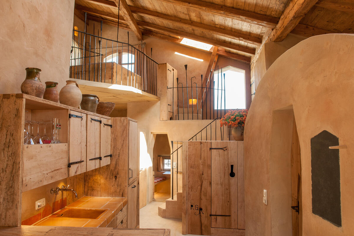 Ein großzügiger Wohnbereich mit großer Dachverglasung, offener Feuerstelle, Kachelofen und traumhafter Wohngalerie sind zweifelsohne Blickfang dieser Ferienwohnung. Von hier erschließt sich der wunderbare Freisitz im malerischen Laubengang mit offener Feuerstelle, das Turmzimmer mit Massivholzbett und Blick auf den Schloss Innenhof und das Badezimmer in der archaischen Gewölbekuppel. Das Bad ist mit exklusiver Whirlwanne, entspannender Regendusche und weitem Blick auf den Horizont eine Wellnessoase für Körper und Seele.