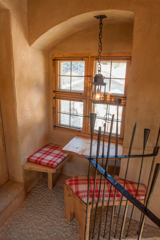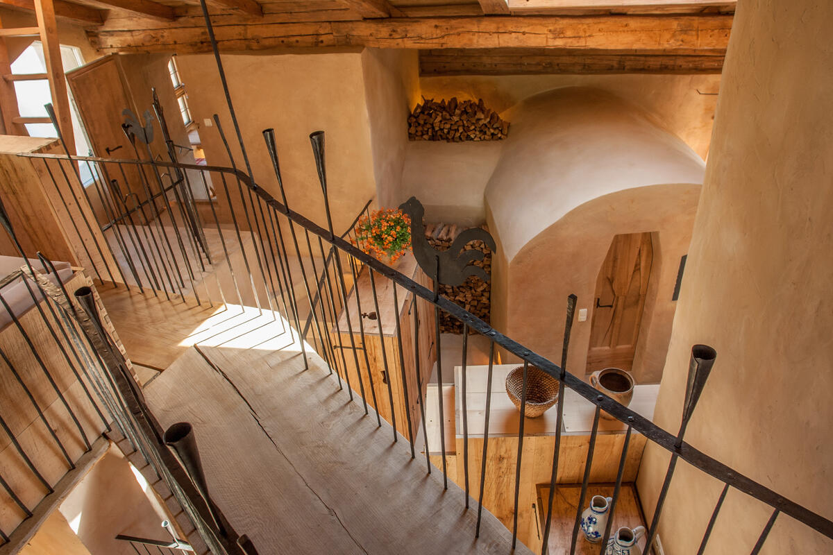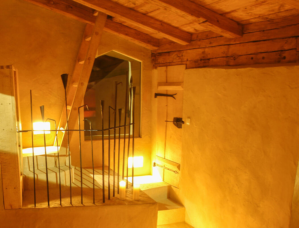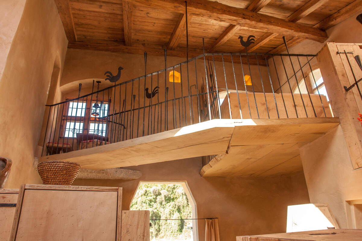 Eine verwinkelte Treppe nach oben führt zum nächsten Schlafzimmer mit kleinem Sitzplatz und Blick auf Schloss Schedling und weiter zur Wohngalerie mit wunderschöner Sitzecke und grandiosem Ausblick. Hier oben, am höchsten Punkt im Turm, geht es über eine breite Holzdiele mit geschmiedeten Geländerstäben zum dritten Schlafzimmer mit romantischem Himmelbett.