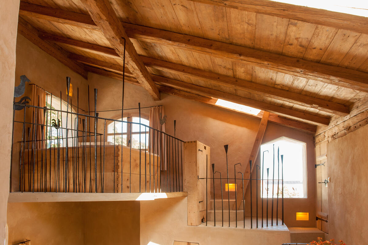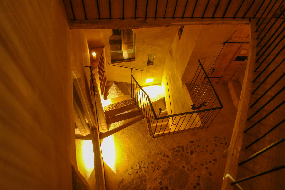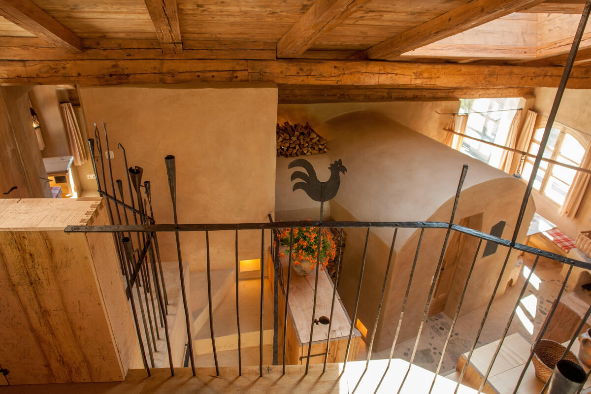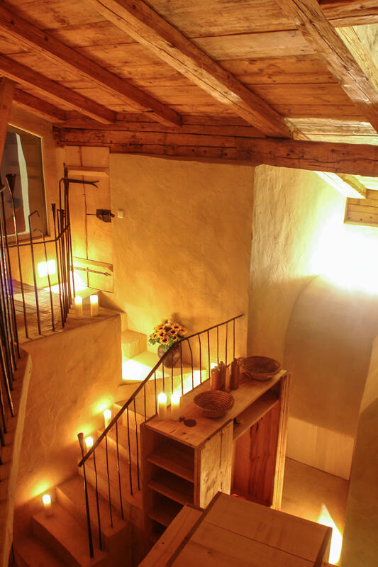 Eine verwinkelte Treppe nach oben führt zum nächsten Schlafzimmer mit kleinem Sitzplatz und Blick auf Schloss Schedling und weiter zur Wohngalerie mit wunderschöner Sitzecke und grandiosem Ausblick. Hier oben, am höchsten Punkt im Turm, geht es über eine breite Holzdiele mit geschmiedeten Geländerstäben zum dritten Schlafzimmer mit romantischem Himmelbett.